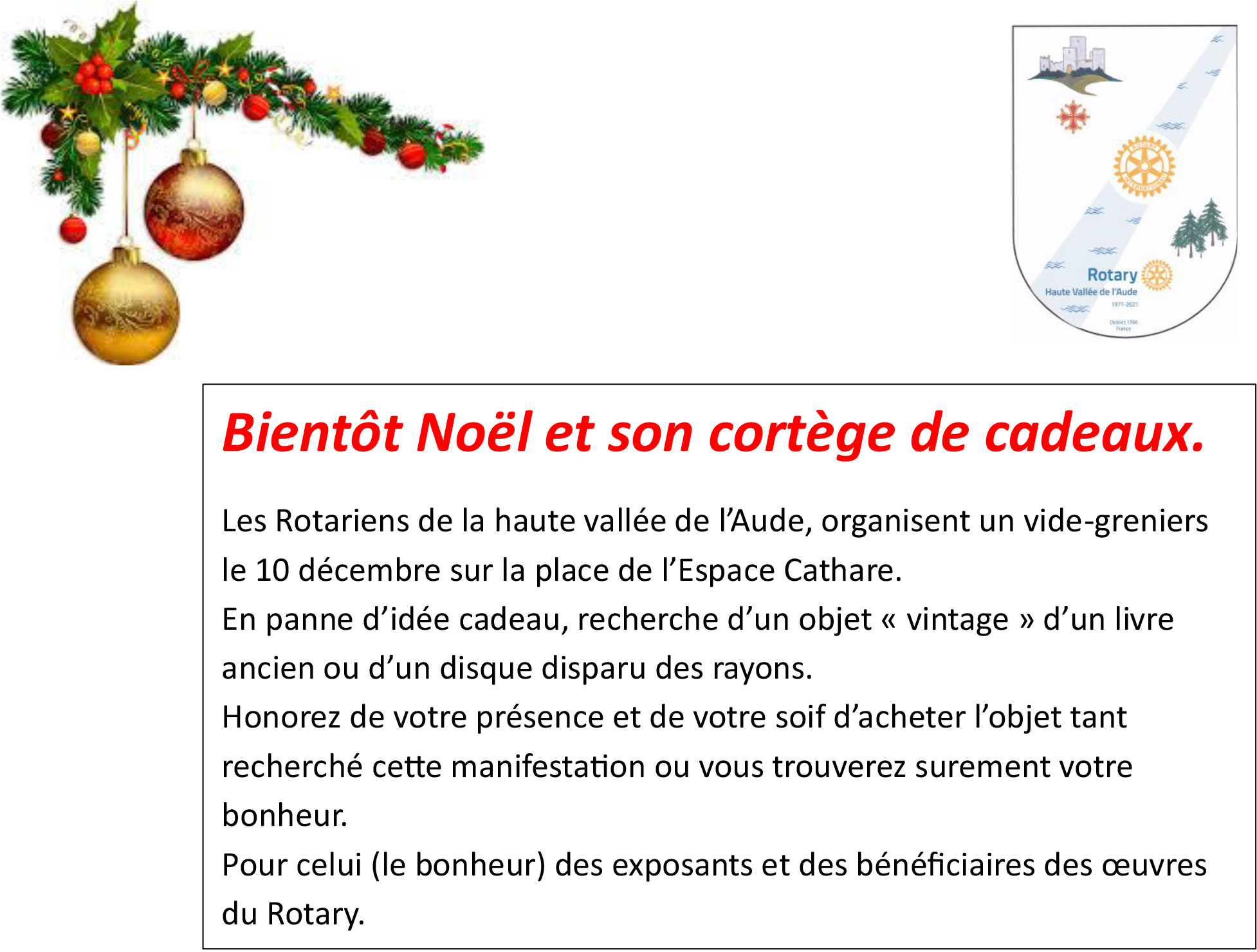 Un immense merci aux entreprises qui ont offert les lots et aux rotariens qui se sont investis pour la préparation, l’animation et le repli en fin de journée. Nous n’oublierons pas de décerner à la Commune de Quillan et à son personnel nos plus vifs remerciements pour la mise à disposition de la salle de la Cigale.