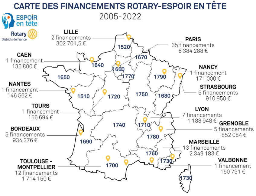 L’action Espoir en tête organisée par les Rotariens de France a permis en 17 ans de verser 15 400 000 € pour 89 projets de gros matériels afin d’améliorer la recherche fondamentale sur le cerveau